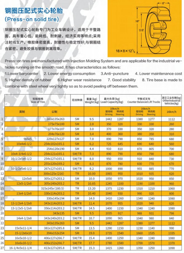 鋼圈壓配式實心輪胎專門為工業車輛設計,適用于平整路面,具有重心低、能耗低、耐刺破,經濟實用等特點;采用注射線生產,橡膠體密度高,耐磨性與穩定性好;與鋼圈結合緊密,避免膠體與鋼圈剝離現象。抓地性強,剎車性能優良,負載行駛穩定性極強,滾動阻力極小,能耗極低,適用于拖車及其它傳動、行走機械。